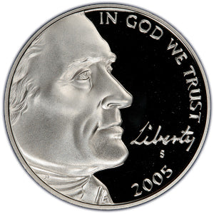 - Obverse in 2005: A ¾ profile of Jefferson inspired by Jean-Antoine Houdon’s 1789 marble bust.
