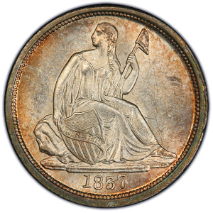 The Liberty Seated Dime, designed by Christian Gobrecht, is an iconic piece of American numismatic history. First introduced in 1837, this design was inspired by Gobrecht’s pattern silver dollars and remained in production for over half a century, undergoing several modifications throughout its long tenure.
