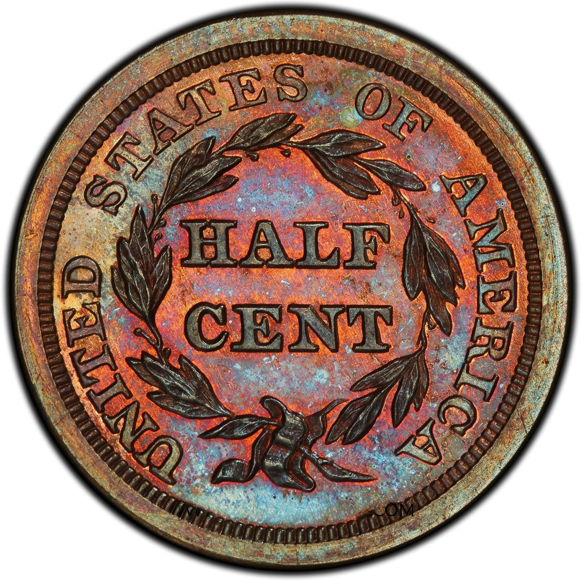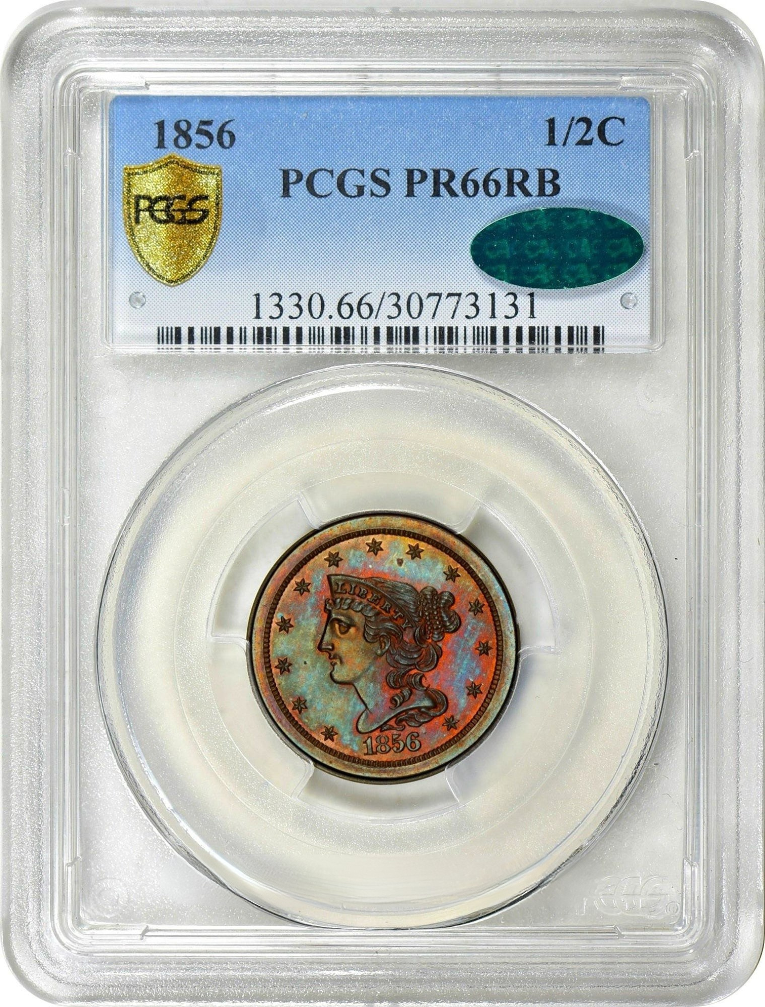 A pop 1/0 in RB, there is no other 66 in either brown or red. This delicately toned draped bust half cent with broad edges stands out superbly. With a price guide of $26,000 and no comp it is not difficult to appreciate the deep cobalt blue/green hues as it transition to bright neon red. Any copper proof is a prized collection, but obtaining a pop 1 single finest copper proof with a bonus cac approval and from the 1850's is a true accomplishment.