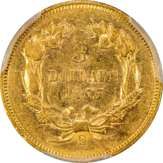 1855-S $3 AU58 PCGS CAC