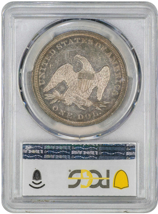 1857 Liberty Seated Dollar, PCGS MS64 CAC — sharply struck with glowing gold-amber toning and vibrant luster.Just ~100 believed to survive in MS60+, with MS65 CAC leaping to ~$100K.